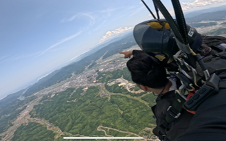 全身の血の気が引くような冷や汗に包まれた瞬間、下から吹き上げる猛烈な風に体が浮かぶような感覚に変わりました。息もできないほどの風圧で、落ちているはずなのに、なぜか空に押し戻されているような不思議な体験でした。パラシュートが開いて、着地するまで、わずか5分間。鳥が自分より下で飛んでいる光景が、なんとも不思議な感覚を体験できました。